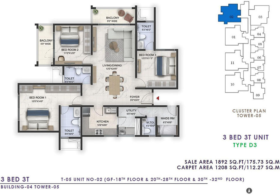 3 BHK+3T (2 Balconies Maid’s Room) | 1858 to 1902 |